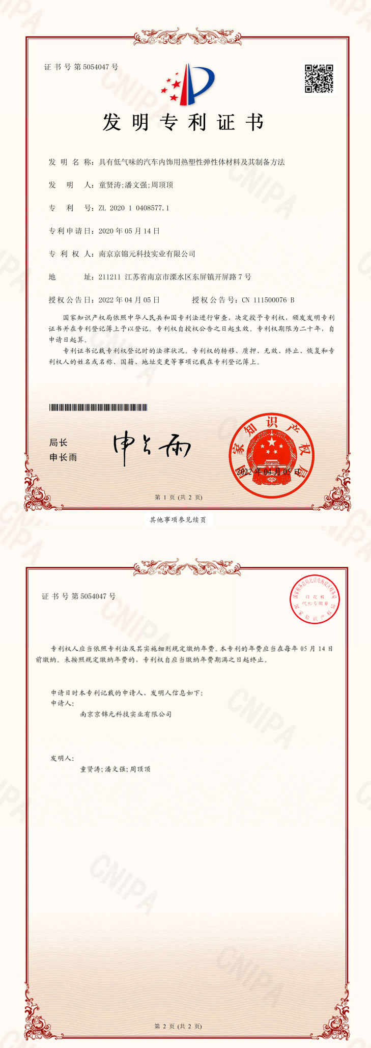 ZL 2020 1 0408577.1 具有低氣味的汽車(chē)內(nèi)飾用熱塑性彈性體材料及其制備方法